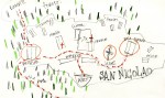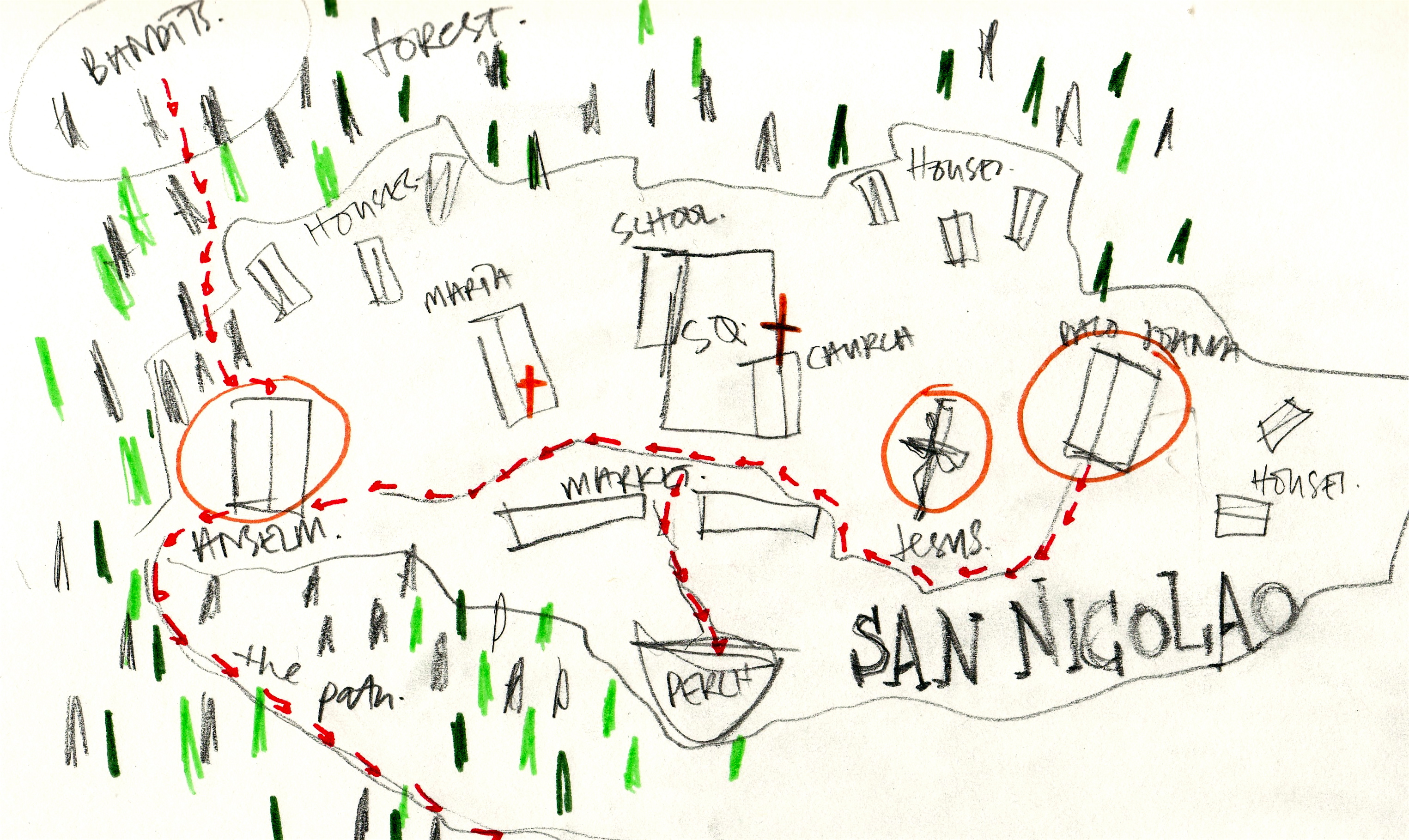In One Hundred Years Of Solitude Gabriel Garcia Marquez prefaces the text with a graphic family tree that explains the lineage of the Buendia family and, by association, the history of the fictional town of Macondo. (Marquez p.iv) Progressing through Marquez’s lengthy narrative I found myself returning often to this family tree. The effect was akin to a wide-shot in film, where one can see a townscape before the camera zooms in to an apartment interior and back again to the big picture. For The Florists of San Nicolao I drew a map of the village and the surrounding area[6], which allowed me to imagine more clearly some of the important locations[7]. When I came to describe the journey Anselm, Joanna and the sleeping Paco make across the night village the map was a creative and very practical aid as indeed was the memory of one real location, that of the hills above the town of Lucca, Italy where I stayed in the summer of 2007. My family would be joined each evening by seven or eight cats who would suddenly appear at the corner of our terrace begging for food. The image of their green eyes glowing in skinny, ragged heads in the semi darkness was unsettling and enchanting[8].